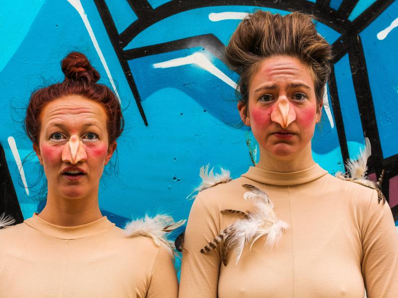 Sorø BibliotekCHICKS er en klovneforestilling for børn i alderen 4-10 år, om to burhøns der oplever friheden for første gang.